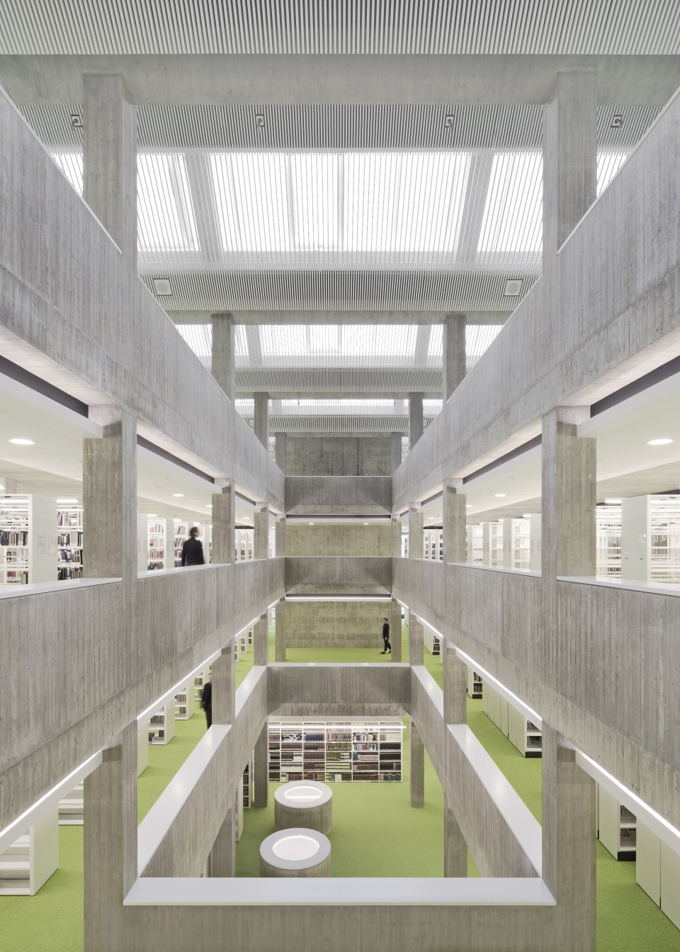 Im ersten Obergeschoss, das über eine Treppe im gesicherten Bereich zugänglich ist, ist unmittelbar am Ende der Treppe die Verbindung zum Altbau angelegt. Der mittlere Bereich des Grundrisses ist mit Regalen belegt. Entlang der beiden Längsseiten reihen sich zum Saal hin Leseplätze, auf der anderen Seite sind zusätzliche Verwaltungsräume untergebracht. Diese Ebene ist durch einen Luftraum mit den weiteren darüber liegenden Geschossen sichtbar verbunden. Im zweiten und dritten Obergeschoss liegen die Leseplätze entlang den gefächerten Außenfassaden. Das Dachgeschoss ist dagegen umgekehrt organisiert: Dort sind die Leseplätze in der Mitte des Grundrisses platziert, da wir auf dieser Ebene über die gefaltete Dachkonstruktion Tageslicht in das Zentrum des Hauses lenken können.