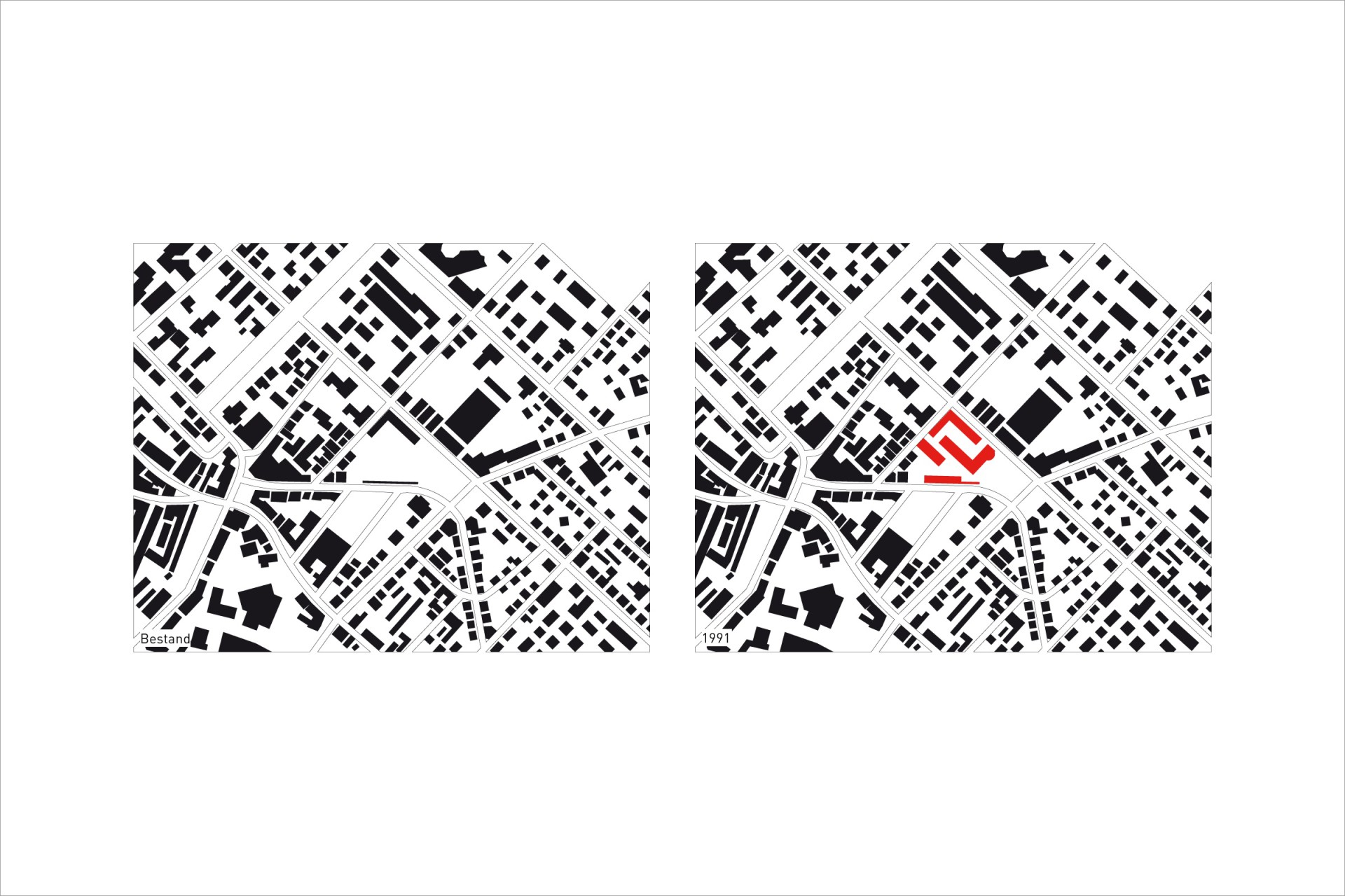 Eine alte Fabrik, in der Papiersiebe hergestellt wurden, sollte zum Finanzamt umgebaut werden. Da ein Teil der alten Hallen unbrauchbar geworden war, entschied man sich für deren Abbruch unter Erhalt der historischen Fassade. Der Komplex befindet sich in einem um 1900 entstandenen Quartier.