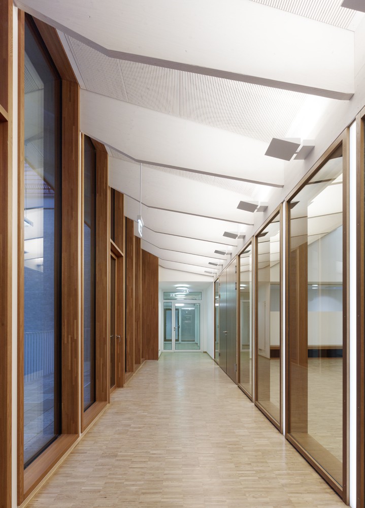 Eine sichtbar belassene Holzkonstruktion überdeckt den Sitzungsbereich. Sie erstreckt sich zwischen dem alten und dem neuen Rathausbau und ist der eigentliche identitätsbildende Part des Ensembles. Dort liegen quer zum Saal in dichter Reihung »Holzschwerter«, deren Mitte von einem in Längsrichtung verlaufenden Oberlicht überspannt wird. Zwei einläufige Treppen verbinden beide Ebenen des Zwischenbaus, der sich zum neuen Platz mit einer Glasfassade öffnet.