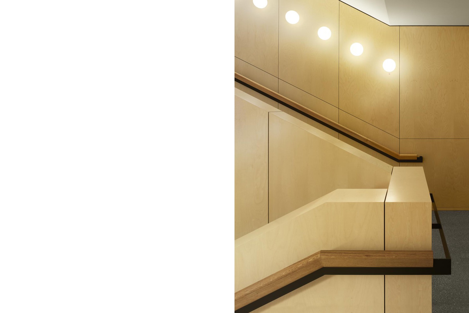 Die Geschosshöhen konnten dadurch neu gewählt werden, freilich in Abhängigkeit zu den Fassadenöffnungen der bestehenden Außenwände. Dadurch konnte eine Ebene zusätzlich in das Gehäuse eingefügt werden. Dort, im ersten Stock ist die gewonnene Stockwerkshöhe relativ niedrig aber für die Unterbringung der Toiletten und Garderoben gut geeignet.