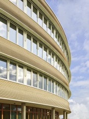 The ring contains the general teaching areas. The building wing running parallel to the contour lines houses the specialist departments and their workshops, among other things. Green courtyards provide natural lighting and pleasant views from the interior rooms.
