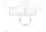 Die Großform der Klinik auf der benachbarten Anhöhe verlangt nach einer markanten Form mit starker Präsenz. Ein Kreis kann dies leisten, zusammen mit einem langen Gebäuderiegel als Halt gebendem Rücken, der das Ensemble trotz der enormen Dimensionen wie selbstverständlich in der Topografie des leichten Hangs verankert.