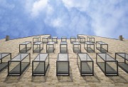 Zur Nordseite hin verbindet ein langer Büroriegel, im gleichen Abstand wie einst die Stadtmauer sämtliche Baulichkeiten der Gesamtanlage. Das Problem langer Baukörper, der mit der Größe einhergehenden Monotonie, die aufgrund der inneren Bedingungen, im Fall der Büronutzung, mit einem Raster verbunden ist, wird mit einem Rhythmus, welcher die Enden gesondert behandelt und der in Zickzackform entworfenen Fensterbänder gelöst.
