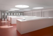 Vom neuen Ensemble soll eine ähnliche Klarheit ausgehen, wie wir sie in den Plänen von 1774 und 1659 vorgefunden haben, dazu orientiert sich der zentrale Baukörper mit seinem Volumen an der St. Josephskirche. Seine Südfassade erinnert an die Komposition des plastisch geformten Kirchenbaus. Die große von oben belichtete Halle, die für unterschiedliche Veranstaltungen der Diözese zu nutzen ist, öffnet sich zur Stadt. Sie ist Auftakt und Gelenk, das alle Einrichtungen und Abteilungen der gesamten Anlage miteinander verbindet und kann bei besonderen Anlässen bis in den Hof und den anschließenden Straßen- und Platzraum der Oberen Gasse, erweitert werden.
