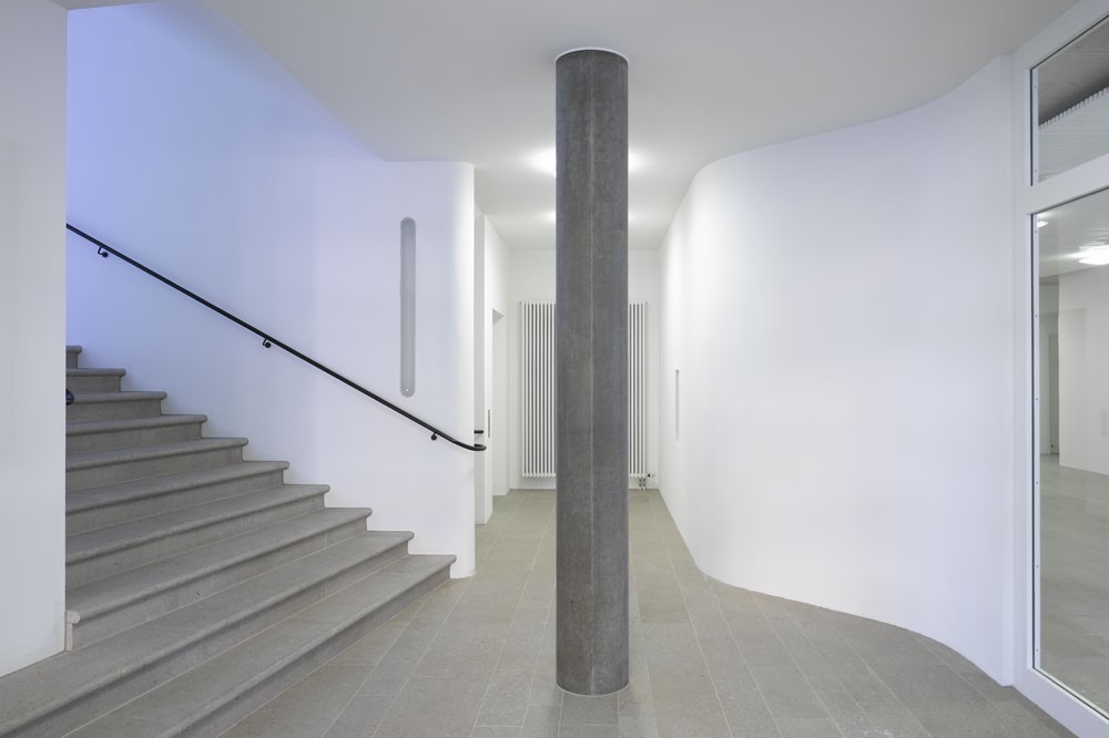 Das Grundstück liegt in einem Quartier, das zu den Straßenräumen hin durch eine Blockrandbebauung der Wende zum 20. Jahrhundert geprägt ist. Mit der verhältnismäßig großen Baumasse versuchten wir, diese Struktur fortzusetzen und zu stärken. Die Staffelung des Dachgeschosses gestattet den Übergang von den höheren Gebäuden im Westen zu den alten Nachbargebäuden auf der anderen Seite. Dort gibt es einen durch Mauerscheiben gebildeten Eingangshof, von dem aus man das Gebäude betritt. Die Obergeschosse erhielten eine Verkleidung mit Schieferplatten, der Sockel ist weiß verputzt.