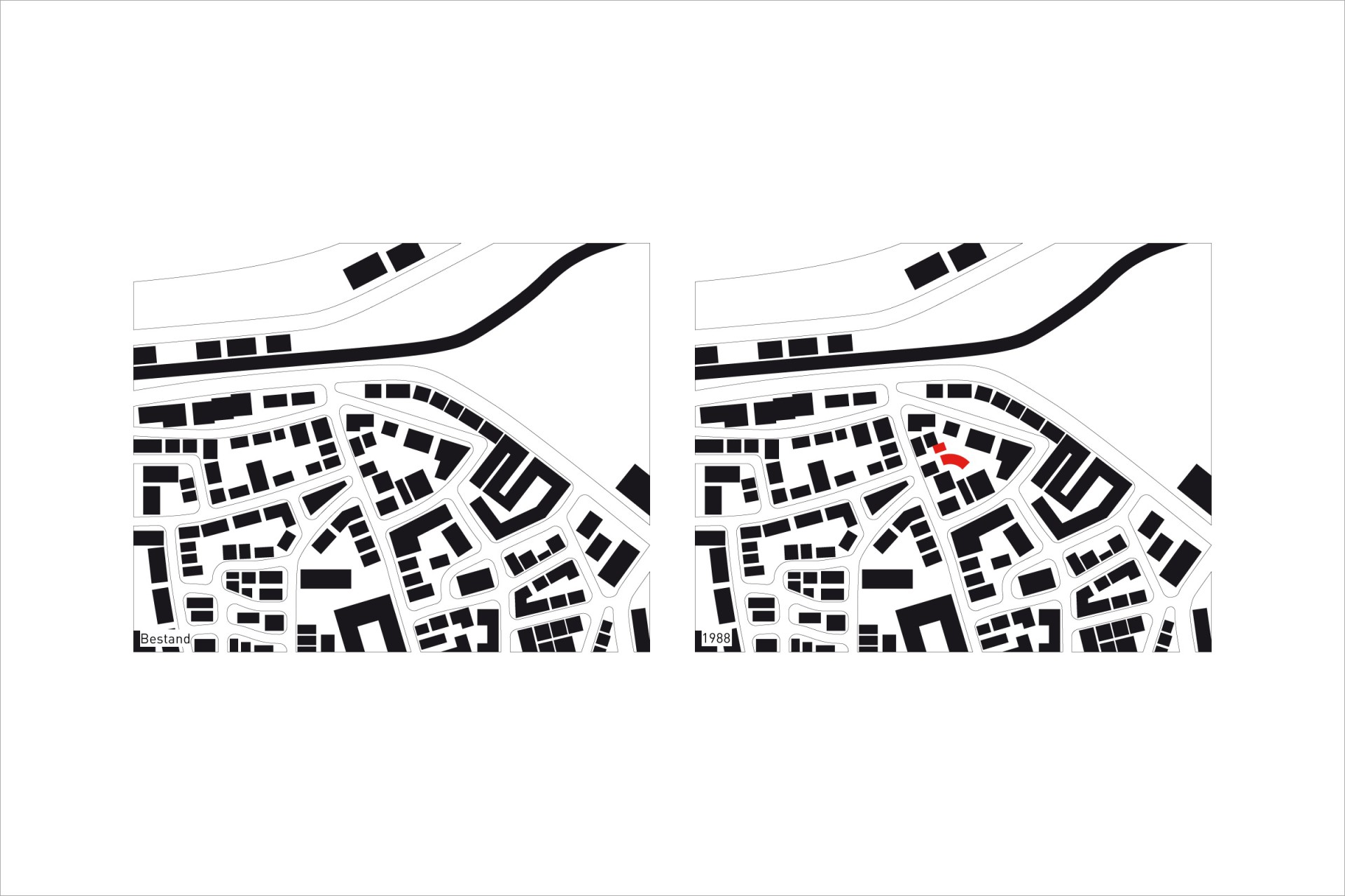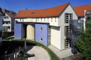 Nachdem im Wettbewerb noch eine reine Wohnbebauung gefordert war, erfuhr das Programm im Zuge der Umsetzung eine wesentliche Änderung: Ein zweizügiger Kindergarten mit Außenflächen bildet nun das Zentrum der Anlage – mit einem Wohnhaus für Behinderte, einem kleinen Gebäude für Wohnzwischennutzung sowie einer Tiefgarage –, die auf einem engen Grundstück in der Altstadt ihren Platz gefunden hat. Für den Entwurf war die Altstadtbildsatzung aus den siebziger Jahren maßgebend. Wenn sich auch damals viele engagierte Architekten gegen gestalterische Verordnungen dieser Art aussprachen, betrachten wir sie aus heutiger Sicht als Vorteil, da sie Neu und Alt erfolgreich zu einer harmonischen Einheit zu verbinden vermag. So ergänzen hier etwa die neuen Wohngebäude der Anlage rund um den Kindergarten den Altstadtbestand relativ unauffällig.
