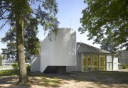 Damit der in Distanz zum Pförtnerhäuschen gelegene Eingangsbereich bereits von der Einfahrt aus sichtbar ist, legten wir vor den bestehenden Windfang die Sicherheitsschleuse, deren Fassade sich nach vorne hin in die Breite entwickelt. Der Bau ist eine Holzkonstruktion, die vollständig mit einer gummiartigen, weißen Beschichtung überzogen ist. Für den Senatssaal, der in einer Bürospange mit größerer Tiefe liegt, entwarfen wir ein hölzernes Innenfutter aus hellem Birkenholz, das die alte Raumkonfiguration nicht mehr erkennen lässt.
