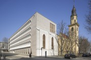 Wolf Irion, architect of the post-war building, had placed the main entrance to the educational centre along Büchsenstrasse. That is a thought that we followed in principle. But we have set it back further into the site, at the intersection with the church. At this point we would like to expressly acknowledge the work of Irion, because his design was a very nice contribution and a good example of post-war architecture in Stuttgart. The demolition is therefore not, for example, due to any dissatisfaction with the form of the ensemble: the reason lay in the dilapidated structure and the fact that the building was no longer able to satisfy diverse requirements, such as those for fire protection. In any case, rehabilitation would have only been possible, if at all, by expending a disproportionate effort. The essential portions of the underground garage were able to be retained, however, even though this has nothing to do with the underlying issue of the architecture.